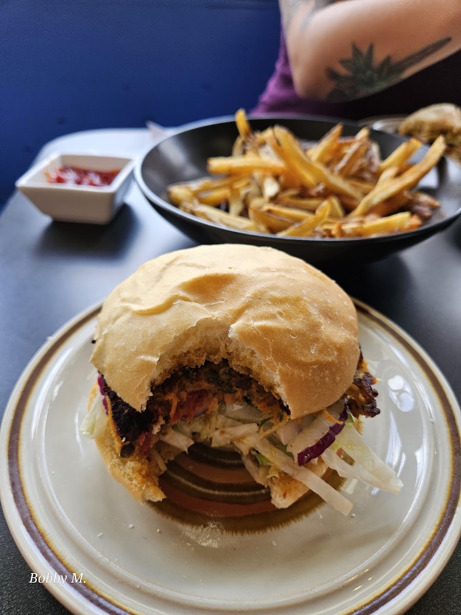 This place is amazing. I have never been to a restaurant that makes meals that are equally amazing for meat and non meat eaters. A good place if you want to meet with friends for dinner and drinks or if you just want a little down time to yourself. The atmosphere is very relaxing, the paintings and drawings are beautifully positioned. Food pricing is perfect. This is my new relax and dine location! The loaded fries looked so good I forgot to take the picture before we ate them. As you can see they were as good as they looked.